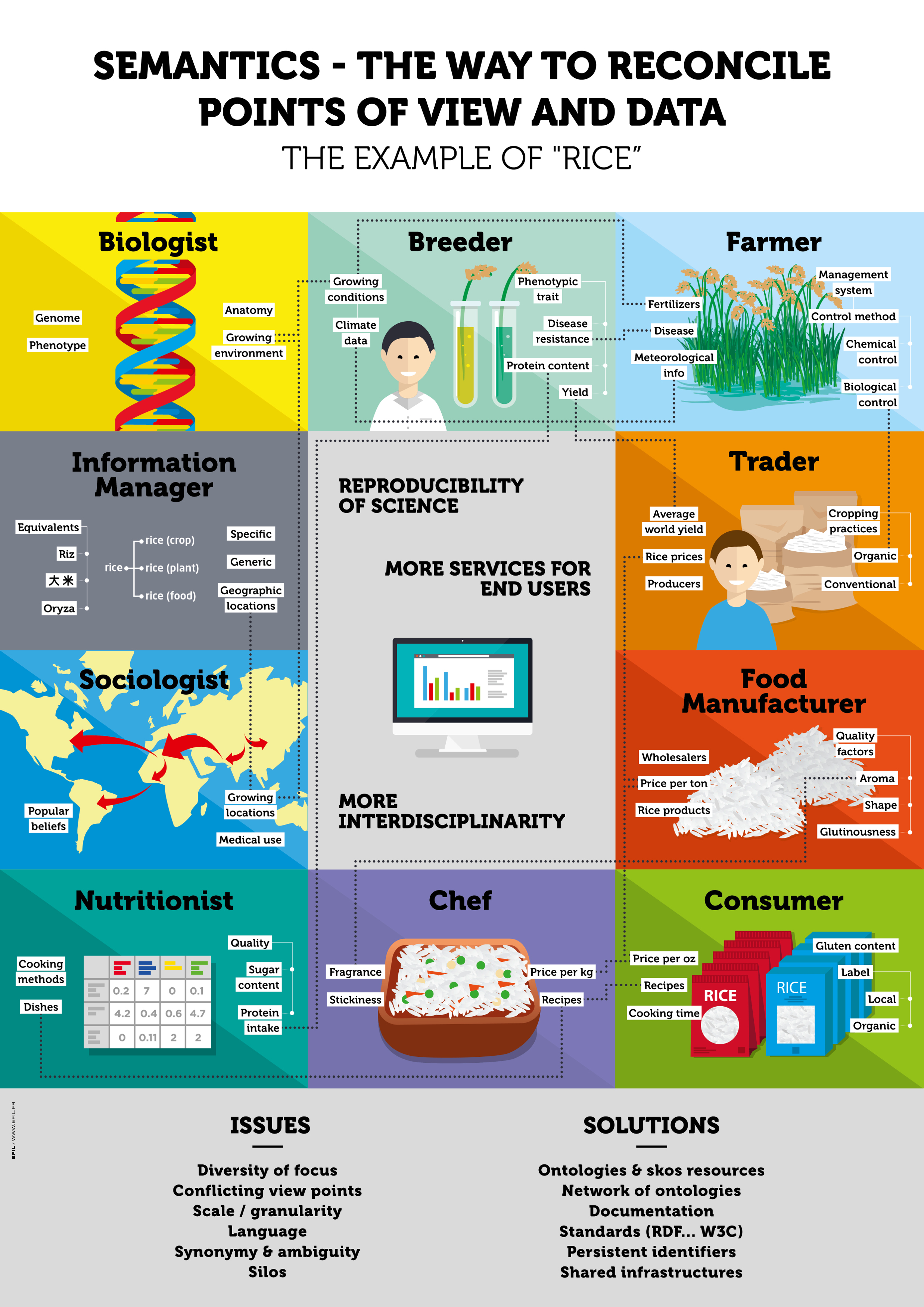 Modern agriculture needs data on a wide range of topics, from crop yields to soil composition and rainfall, in a wide range of digital formats, from spreadsheets to maps. How well such diverse data sources can be integrated to solve specific problems in agriculture depends in part on whether its "meaning" is correctly defined, which allows it to be used in a straightforward manner in different information systems ("semantic interoperability").